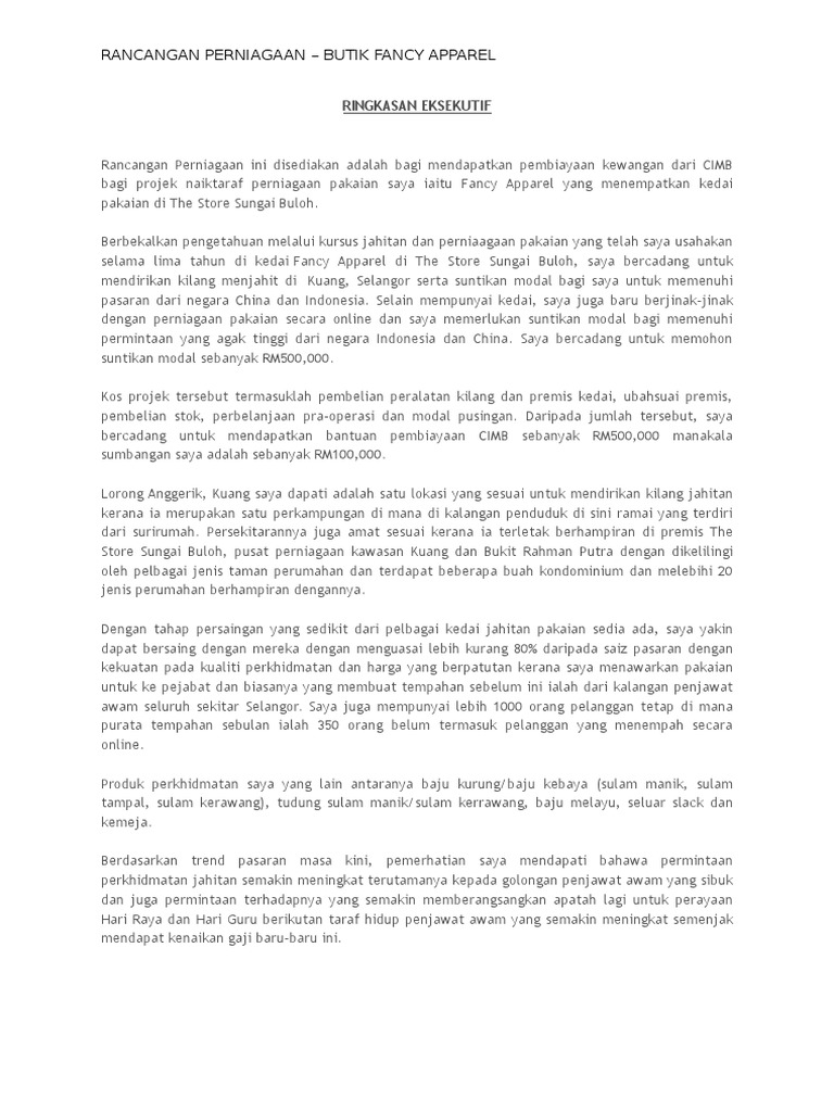 Related : Contoh Rancangan Perniagaan Butik Pakaian Pdf : Rancangan perniagaan ini disediakan adalah bagi mendapatkan pembiayaan kewangan dari cimb bagi projek naiktaraf perniagaan pakaian saya iaitu fancy apparel yang menempatkan kedai pakaian di the store sungai buloh..