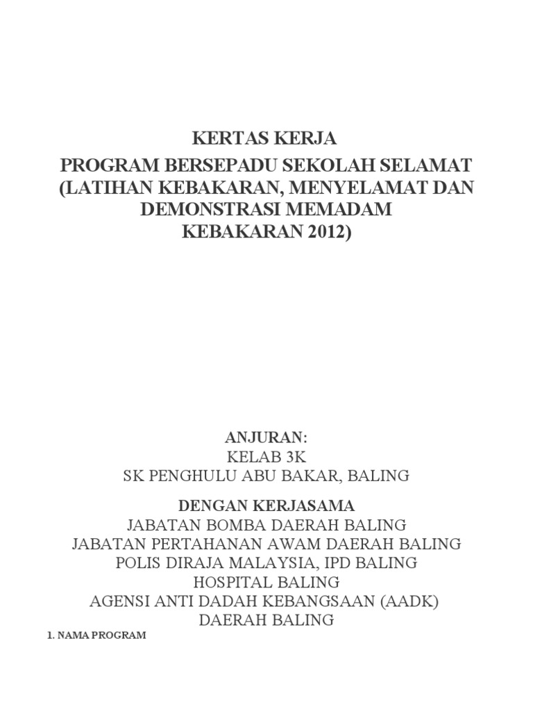 Kertas kerja program peningkatan akademik. Nama programlatihan kebakaran (nama sekolah)2010 bertema melahirkan persekitaran yang selamat. Kertas kerja program bersepadu sekolah selamat (latihan kebakaran, menyelamat dan demonstrasi memadam kebakaran 2012). Kertas kerja bulan sains dan matematik. Sedikit info mengenai kertas kerja ini.
