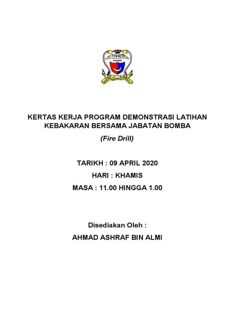 Kertas Kerja Latihan Kebakaran - Penutup jawatankuasa latihan kebakaran kolej kediaman ipgm kampus tun hussein onn memerlukan kerjasama semua pihak bagi.. Kunjungan ke laboratorium uji api. Koordinator latihan kebakaran juga harus mereview prosedur rencana evakuasi sebelum dilakukan latihan kebakaran dan mengidentifikasi pembaharuan yang diperlukan sebagai hasil dari perubahan operasional, perubahan fasilitas maupun perubahan karyawan di tempat kerja. Contoh surat mohon tukar sekolah. Kertas kerja program peningkatan akademik. 11.00 pagi hingga 1.00 petang.